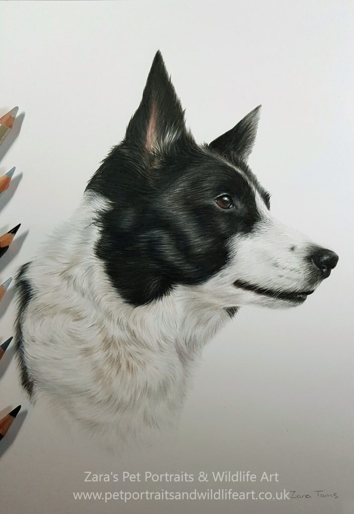 For this portrait I didn’t have the sharpest reference photograph to work from. It was a photograph taken on a mobile phone of the original photograph. That meant the detail was ideal but you could make out the clumps and clusters of some of the fur. I have drawn so many dogs that I felt I would be able to add more detail to the drawing than that of the original.