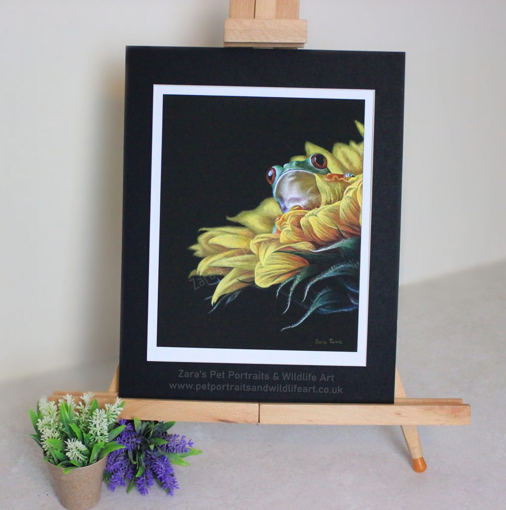 April is National Frog Month! Frogs are fascinating creatures and with over 4,000 species of frogs they come in a range of colours from all over the world. I have only done 1 frog portrait and this is it. The Red Eyed Tree Frog in this vibrant yellow flower was what drew me to the reference. That vibrancy against the black worked so well for my techniques. As you know I LOVE drawing on black backgrounds. My recent Lions on a black acrylic was my latest but this piece is black paper with colour pencil :).
