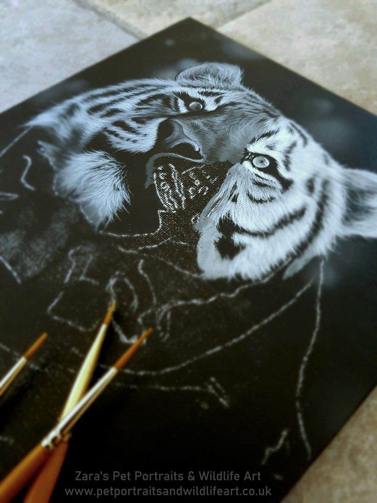 You may have seen on previous blog posts and over on my social media just how much I love working in black and white. Two colours and a 2 paint brushes is all that’s been used for the Tiger. I used my airbrush for the background and for the bokeh background effect.