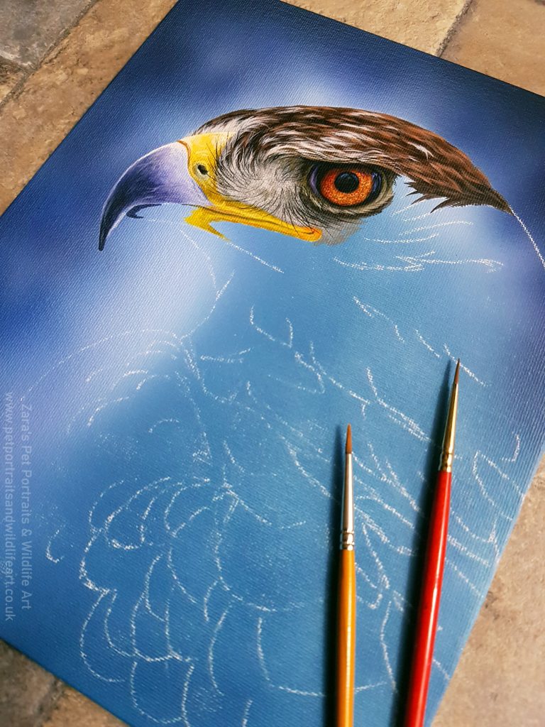 A few days ago I shared the first update showing the background in progress :). This is the first close up bird painting I have done and so far I am loving the challenge of feathers! I may not be thinking the same when it comes to all those body feathers 😂.
